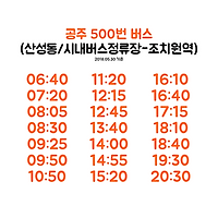 | 공주 와 세종 을 오가는 공주 500번 버스 시간표 / 공주시 500번 버스 시간표 (0) | 2018.05.30 |